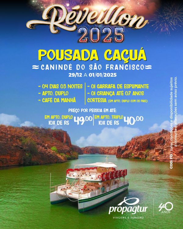 Réveillon 2025 – Pousada Caçuá – Canindé do São Francisco 03 Dias / 02 Noites + Café da Manhã e Jantar + Acesso ao Hot Park e Parque das Fontes + 02 Crianças Até Cinco Anos Cortesia Preço por pessoa em cabine dupla: em até 12x de R$ 127,80, valor total R$ 1.278,00. Solicite Orçamento